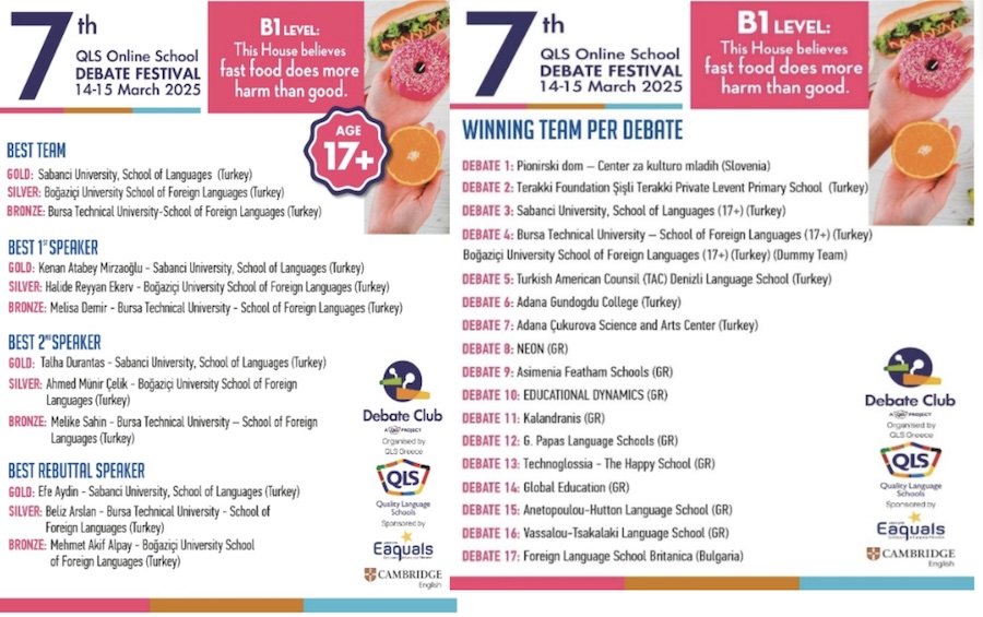 The Sabancı University School of Languages Debate Team has been awarded the Golden Cup for Best Winning Team in the 17+ category at the 7th QLS Online School Debate Festival.